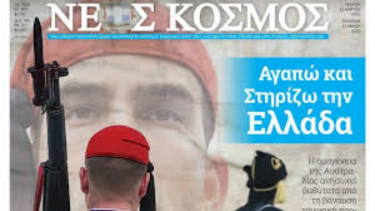 Με κεντρικό θέμα  και τίτλο στο πρωτοσέλιδό της το σύνθημα «Αγαπώ και Στηρίζω την Ελλάδα» κυκλοφορεί σήμερα η ομογενειακή εφημερίδα «Νέος Κόσμος», σε μια προσπάθεια να εκφράσει την ανησυχία των Ομογενών για όσα συμβαίνουν σε Αιγαίο και Έβρο, αλλά και την αλληλεγγύη τους προς την Ελλάδα.