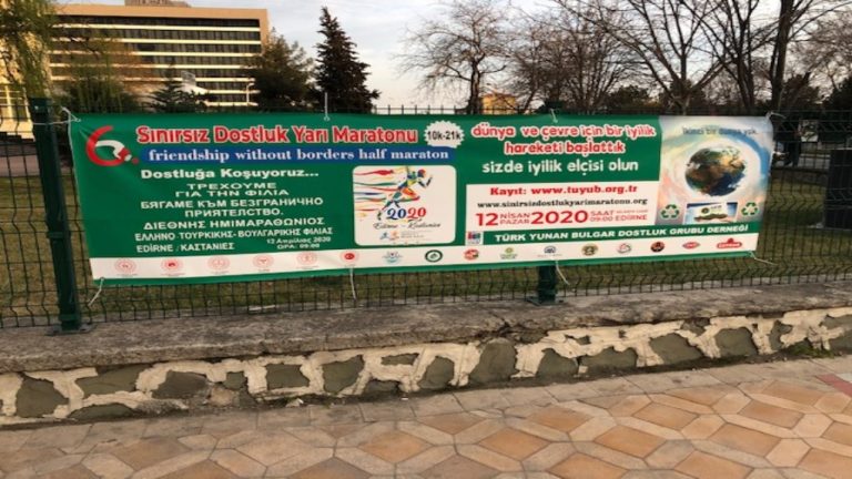 Οι πινακίδες και τα πανό απέναντι από το «Εράστα», το μεγαλύτερο και πιο σύγχρονο εμπορικό κέντρο της Αδριανούπολης είναι εύγλωττες, μεγάλων διαστάσεων και σχεδόν στο σύνολό τους διαφημίζουν τη διεξαγωγή ενός διεθνούς ημιμαραθωνίου που επρόκειτο να πραγματοποιηθεί στις 12 Απριλίου με σκοπό την προώθηση της… Ελληνό – τουρκικής και βουλγαρικής φιλίας. Φέροντας τον τίτλο «τρέχουμε για τη φιλία», η συγκεκριμένη εκδήλωση αν και ενταγμένη στην τουρκική προπαγάνδα που θέλει την Τουρκία να επιζητεί την ειρήνη με τους γείτονές της, δεν παύει να αποτελεί ένα από τα πολλά παράδοξα που συνθέτουν τις σχέσεις μεταξύ των δύο λαών. Ενδεικτικά να σημειώσουμε πως πέρσι ο ημιμαραθώνιος ήταν να πραγματοποιηθεί ανήμερα το Πάσχα!