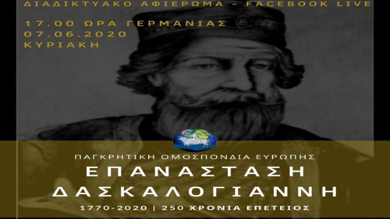 Σε ανακοίνωσή της η Πρόεδρος της Ομοσπονδίας Κρητικών Συλλόγων Ευρώπης, Ευτυχία Ολόφσον-Σαβιολάκη, ενημερώνει για το δεύτερο μέρος του αφιερώματος αύριο Κυριακή 7.06.20 και ώρα 17:00 με θέμα «Αφιέρωμα στα 250 χρόνια από την Επανάσταση του Δασκαλογιάννη». Η παρουσίαση θα γίνει μέσω της σελίδα της Ομοσπονδίας στο facebook .
