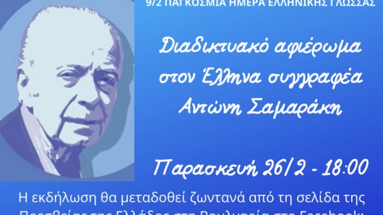 Με αφορμή την Ημέρα της Ελληνικής Γλώσσας που γιορτάζεται κάθε χρόνο στις 9 Φεβρουαρίου και την πρόσφατη συμπλήρωση 100 ετών από τη γέννηση του σπουδαίου και πολυμεταφρασμένου Έλληνα συγγραφέα, Αντώνη Σαμαράκη, η Πρεσβεία της Ελλάδος στη Βουλγαρία, σε συνεργασία με τον Τομέα Νεοελληνικής Φιλολογίας του Τμήματος Κλασικής Φιλολογίας του Πανεπιστημίου Σόφιας, το Τμήμα Νεοελληνικών Σπουδών της Φιλολογικής Σχολής του Πανεπιστημίου της Φιλιππούπολης και τις εκδόσεις Ψυχογιός, διοργανώνουν διαδικτυακό αφιέρωμα στον Αντώνη Σαμαράκη, την Παρασκευή 26 Φεβρουαρίου, στις 18:00 (ώρα Ελλάδας) η οποία θα μεταδοθεί ζωντανά μέσω της σελίδας της Πρεσβείας της Ελλάδος στο Facebook @GreeceInBulgaria: https://www.facebook.com/GreeceInBulgaria