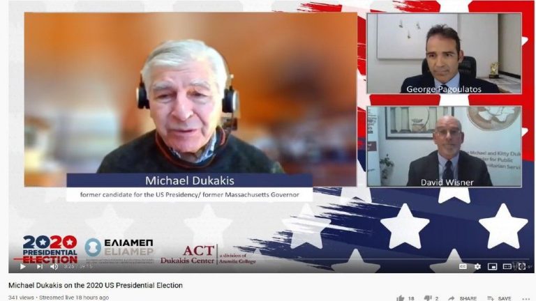 Ο Μάικλ Δουκάκης, πρώην υποψήφιος πρόεδρος των ΗΠΑ και πρώην Κυβερνήτης της Μασαχουσέτης, σχολίασε τις Αμερικανικές Προεδρικές Εκλογές σε διαδικτυακή εκδήλωση του Dukakis Center του ACT και του ΕΛΙΑΜΕΠ  την Πέμπτη 5 Νοεμβρίου, σε μία από τις σπάνιες δημόσιες τοποθετήσεις του.
