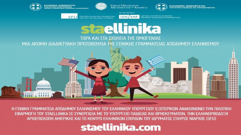 Η Γενική Γραμματεία Απόδημου Ελληνισμού (ΓΓΑΕ), ανακοίνωσε την έναρξη της πιλοτικής εφαρμογής της μαθησιακής πλατφόρμας για την ελληνική γλώσσα staellinika, η οποία θα πραγματοποιηθεί σε επιλεγμένα σχολεία της Ελληνορθόδοξης Αρχιεπισκοπής Αμερικής, σε συνεργασία με το Υπουργείο Παιδείας και Θρησκευμάτων και το Ίδρυμα Σταύρος Νιάρχος Κέντρο Ελληνικών Σπουδών στο πανεπιστήμιο SIMON FRASER, και με την υποστήριξη του Ιδρύματος Σταύρος Νιάρχος.